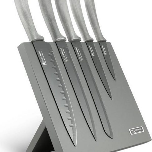 - Verpakkingsinhoud: Een massief houten standaard Een chefs mes (20cm), Een broodmes (23cm), Een groente mes (20cm), Een universeel mes (12.5cm), Een fruitmes (16.5cm)